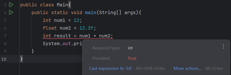 아래와 같이 코드를 작성하면 빨간 지렁이가 생긴다. 이는 float형을 int형 변환하면 값이 손실될 수 있어서 생기는 오류이다. 현재 코드가 실행되면 float형인 num2를 int형(result)로 형변환 해야한다. 범위가 큰 값이 범위가 작은 값으로 변환되며 값이 손실되기 때문에 자바 컴파일러가 막는 것이다.