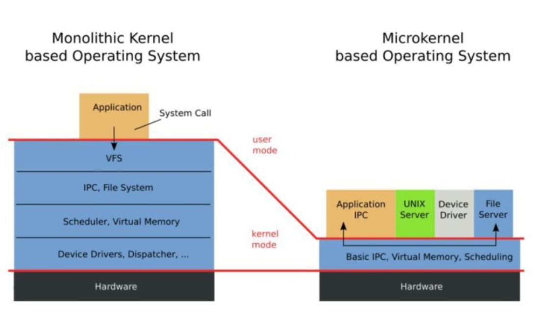 마이크로 커널은 기존의 모놀리식 커널에서 핵심 서비스(Process/ Memory/Network Management)만을 남겨두고 나머지를 제외하여 가볍게 만든 커널이다. 기존의 모놀리식 커널이 가지고 있던 시스템 서비스들(VFS, IPC...)이 마이크로 커널에서는 개별적인 서버 형태로 존재한다.