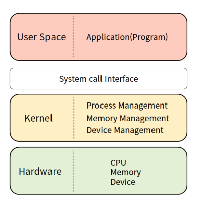 ▼ 앞서 말한 커널 구성 요소들이 존재하는 공간을 Kernel Space라고 할 수 있다. Kernel Space 위에는 사용자로 여겨지는 User Space가 있으며 여기에 Task, Process들이 존재한다. 그리고 이 User Space와 Kernel Space 사이에는 보이지 않는 System Call Interface가 존재한다(뒤에서 다룬다). 유저 스페이스의 Task 또는 Process들이 커널이 관리하는 자원에 접근해야할 필요가 있을 때 -> System Call Interface를 통해 -> 커널 스페이스의 자원관리자에게 요청이 전달되는 방식이다. 이 과정이 이루어지면 커널은 사용자 요청에 맞는 하드웨어에게 명령을 전달하고 작업을 수행하게된다.