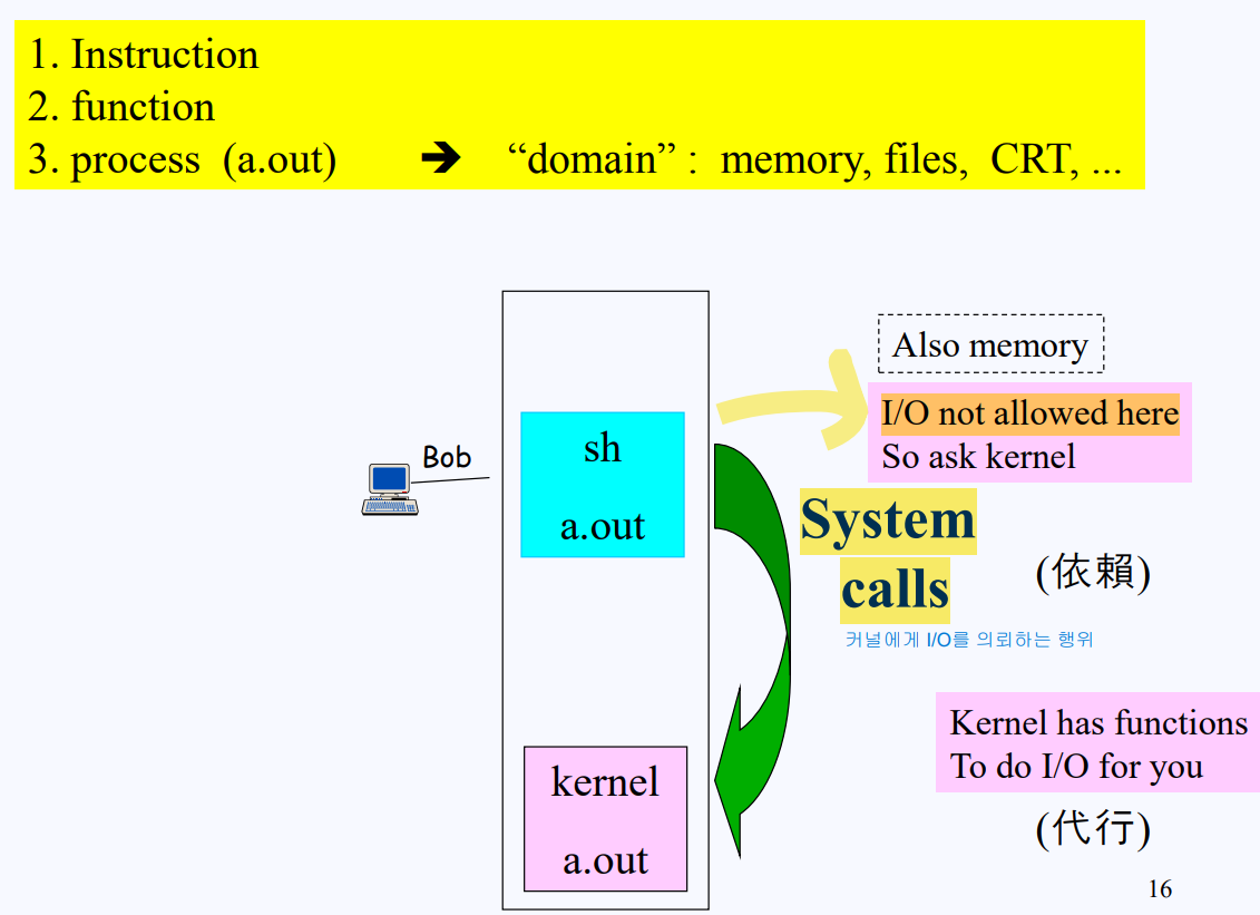 아래 사진을 보자. 현재 Bob의 쉘에 CPU가 양도되었고, 메모리에 올라온 프로그램은 I/O 연산이 진행되어야 하는 상황이다. 하지만 위에서 사용자는 I/O를 할 수 있는 권한이 없다고 했다. 따라서 Bob은 해당 작업을 커널에게 요청하고 -> 커널은 커널 내의 function을 이용해 I/O을 진행해준다. 이렇게 사용자가 커널에게 I/O를 요청하는 것을 System Call이라고 한다.