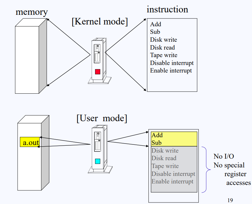 CPU의 mode bit가 어떻게 사용되는지 살펴보자. 우선 mode bit이 1로 세팅되어 있으면 Kernel mode, 0으로 세팅되어 있으면 User mode라고 가정해보자. mode bit가 kernel mode로 세팅되어 있는 상황에서는 CPU는 모든 메모리 영역에 접근 가능하며 모든 명령어 수행이 가능하다. 반대로 mode bit가 user mode로 세팅되어 있으면, 나의 주소(사용자의) 영역에만 접근이 가능하며 I/O 명령, 파일에 영향을 미칠 수 있는 특수 명령 수행이 불가능하다. 즉 제한적인 명령어 수행만 가능하다.
