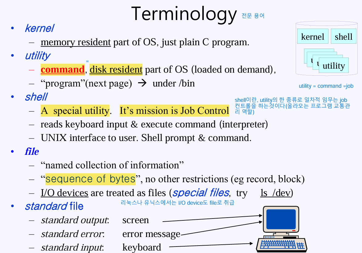 2. 커널 이외의 것들은 전부 Utility이다. Utility는 항상 Disk에 있다가 필요할 때만 메모리에 올라오고 내려간다. 이를 Command라고도 한다