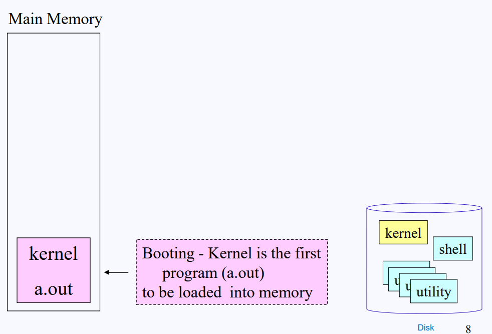 사용자가 컴퓨터 전원을 키면, 컴퓨터가 부팅되면서 디스크에 있던 Kernel Program이 제일 먼저 메모리에 올라간다.