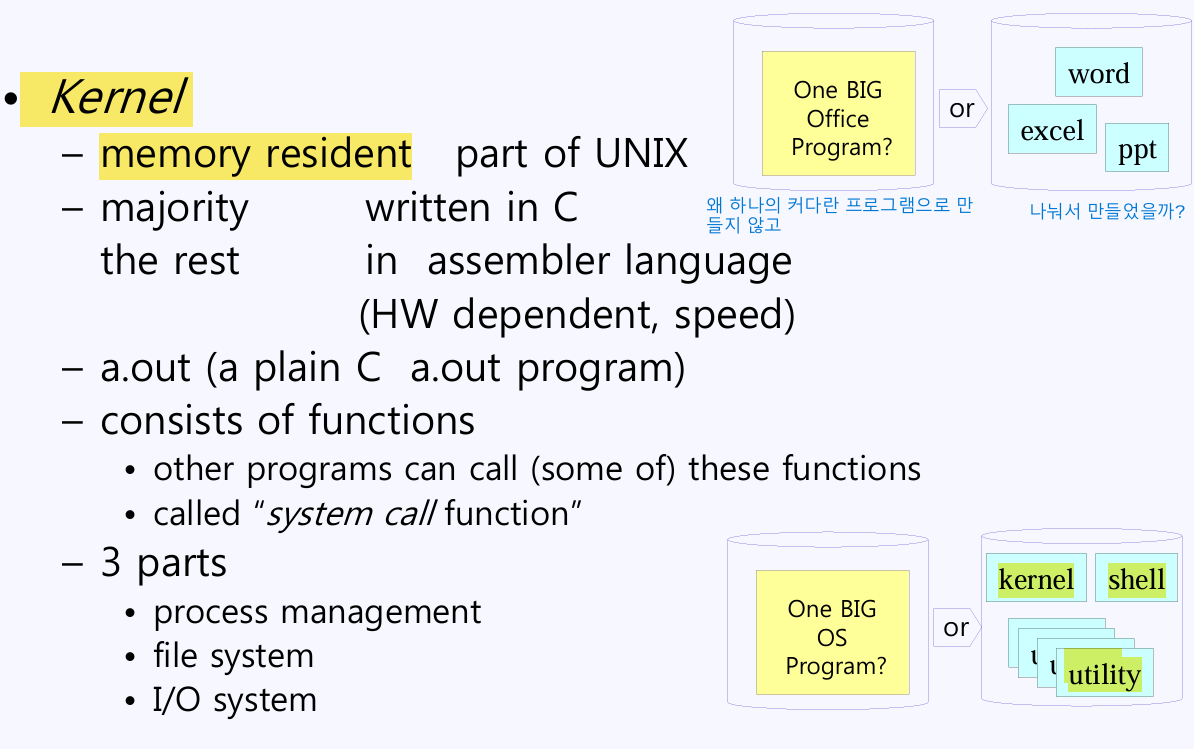 이러한 이유로 Office는 전체의 프로그램이 아닌, 기능에 맞는 프로그램들로 분할하여 출시되었다. 이와 마찬가지로 Linux도 OS를 하나의 커다란 프로그램이 아닌 Kernel, Shell, Utility 등의 프로그램으로 분할해 두었다.