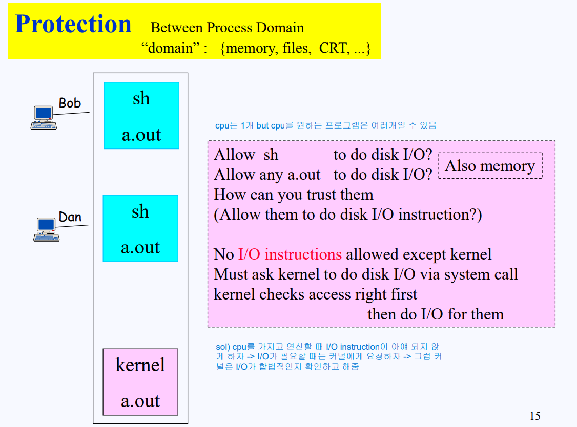 컴퓨터는 1코어 CPU를 탑재하고 있으며, 현재 Bob과 Dan의 프로그램이 메모리 위에서 실행되고 있다. CPU는 연산에 필요한 로직이 수행될때 무조건 Bob 또는 Dan의 프로그램을 위해 사용되어진다. Bob의 프로그램이 CPU를 차지했다고 가정해보자. Shell 또한 프로그램이기 때문에 의도치 않은 오류가 발생할 수 있으며, 이러한 오류로 인해 Bob이 read/write 해야하는 영역이 아닌 허용되지 않은 디스크나 메모리 영역(ex. Dan의 영역)에서 read/write가 수행될 수 있다.