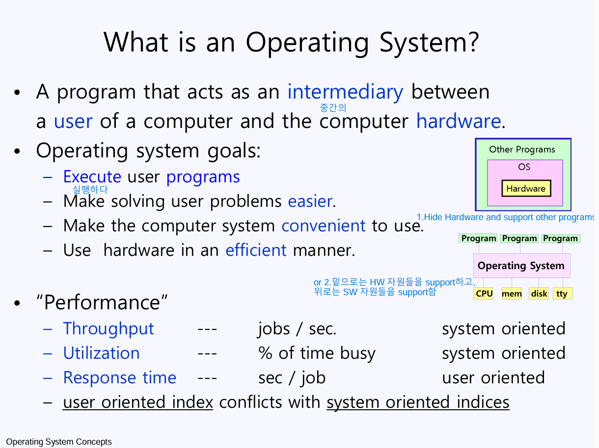운영체제란, User와 컴퓨터 하드웨어 사이에서 동작하는 프로그램이다. 하드웨어 자원들(CPU, Memory, Disk, tty)을 관리하고 프로그램들을 지원해준다. 조금 더 쉽게 표현하면, 하드웨어 자원들을 감싸고(감추고) 다른 프로그램들이 원할하게 동작하도록 도와주는 시스템이라고 할 수 있다.