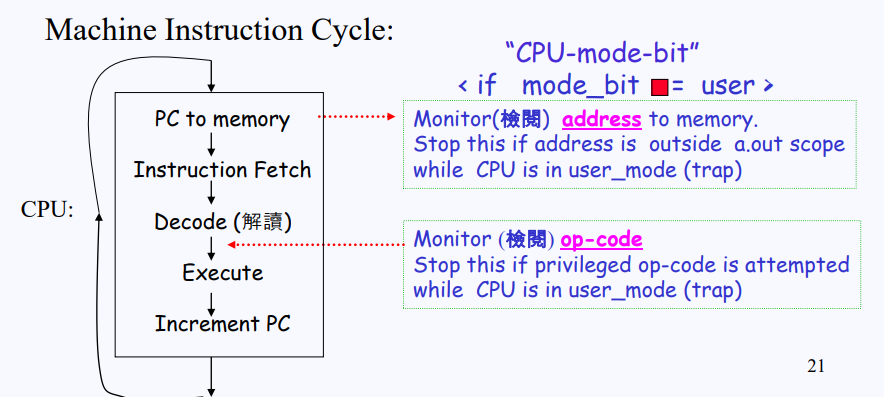 그렇다면 설정된 mode bit는 어떤 영역에서 검사되어질까? CPU 명령어 사이클을 살펴보면, PC 레지스터에서 메모리로 수행할 명령어의 주소를 보낼 때 mode bit가 user mode라면 CPU와 메모리 사이에 존재하는 MMU(Memory Management Unit) 하드웨어가 CPU에서 전송되는 주소를 체킹한다. 만약 사용자가 요청한 명령어의 주소가 사용자 로컬 범위 밖에 위치하는 주소하면 그 즉시 CPU를 뺏겨버린다. 만약 범위 문제 없이 정상적으로 명령어를 가져왔다면, 해독 단계에서 opcode를 보고 명령어가 어떠한 역할을 하는지 파악한다. 그리고 수행되기 전에 한 번 더 op-code를 보고 이것이 권한이 있는(priviledged) op-code인지 아닌지를 체크한다.
