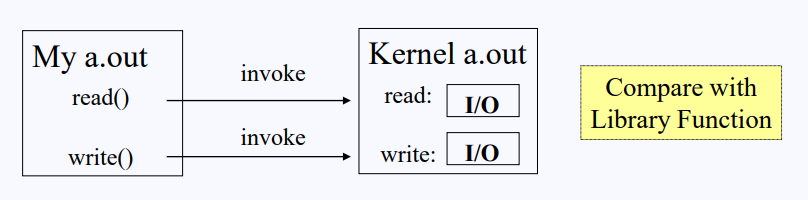내가 작성한 a.out 프로그램을 보면, read()와 write()가 사용되고있다. 나는 현재 read로 어떤 파일을 읽어오라고 코딩을 해놓았다. 하지만 이러한 read 즉 I/O가 있는 것처럼 보이는건 소스코드에 한정된다. 컴파일 과정을 거친 소스코드(바이너리)를 보면 그 안에는 I/O statement가 없다. 소스코드에 존재하는 read 같은 I/O가 필요한 부분들은 컴파일 과정에서 컴파일러에 의해 전부 chmodk(change mode protection kernel) 명령을 수행하도록 변경된다.