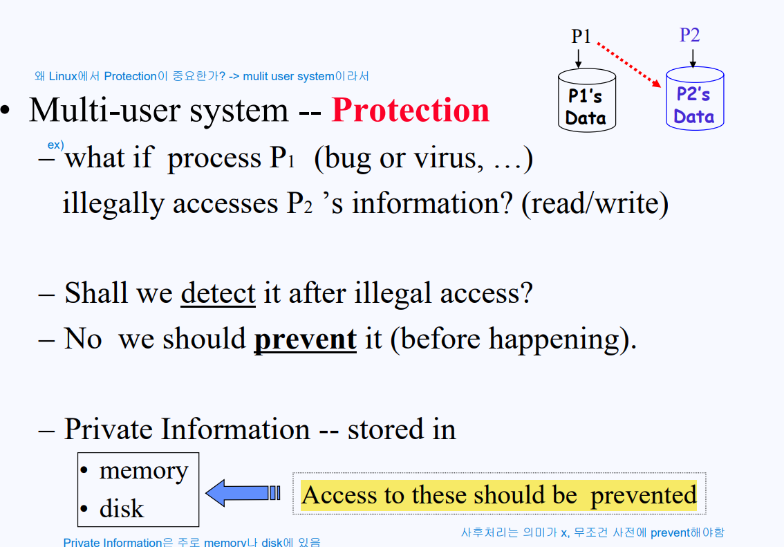 리눅스는 Windows와 달리 멀티 유저 시스템이기 때문에 여러 사용자가 동시에 메모리에 접근할 수 있다. 만약 한 프로세스가 다른 프로세스의 정보를 read/write하면 어떻게 될까? 악의적인 사용자가 내 개인정보를 read하거나, 저장되어 있는 정보를 다른 정보로 write해 덮어버릴 수도 있다. 이런 중요한 정보들은 주로 Memory 또는 Disk에 위치하기 때문에 다른 사람이 해당 위치에 있는 내 정보에 접근 하는 것을 막아야한다. 문제가 발생한 후에 악의적인 사용자의 접근을 막는 사후 처리는 아무런 의미가 없기 때문에, 최대한 사전에 악의적인 사용자의 접근을 막아야한다.