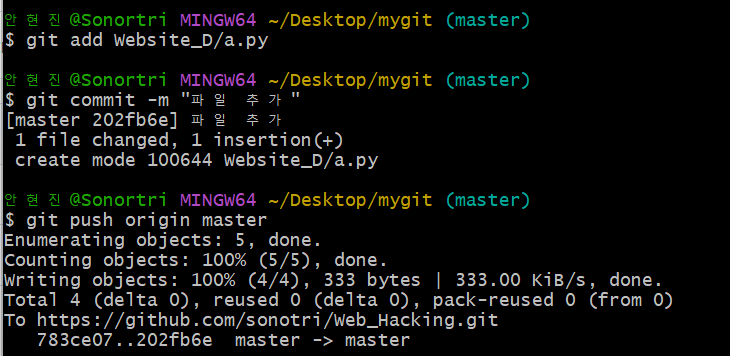 2) 업로드 할 코드를 하위 폴더에 작성하고, git add, git commit, git push 과정을 동일하게 진행하면 된다. 주의할 점은, 현재 하위 폴더에 사용자가 위치해 있지 않으므로, 코드를 저장할 폴더 경로를 적어줘야한다. git add Website_D/ [파일 명]은 mygit폴더 아래에 있는 Website_D 폴더에 a.py 파일을 저장하겠다는 의미이다.