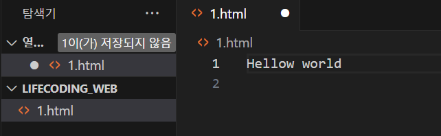 +파일 옆에 동그라미가 있으면 저장이 되지 않은 것이다. ctrl + S로 저장하면 엑스 모양으로 바뀐다.
