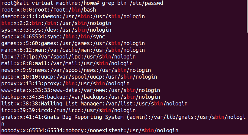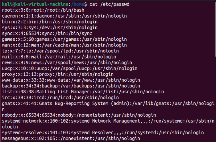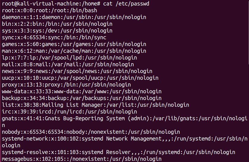 /etc/passwd 는 리눅스의 유저 정보를 담고 있는 텍스트 파일이다. 각 사용자의 이름, 사용자 ID, 속해있는 그룹 ID 등의 정보를 포함하고 있다. 앞에서 배웠던 cat명령어를 사용하여 /etc/passwd 파일의 내용을 확인할 수 있다.