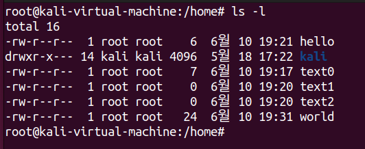 - /home: 각 일반 유저의 홈 디렉토리를 담고 있는 디렉토리이다. 일반 유저들은 각긱 자신만의 홈 디렉토리를 가지고 있다. 예를 들어 kail 유저의 홈 디렉토리는 /home/kali이다