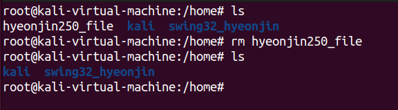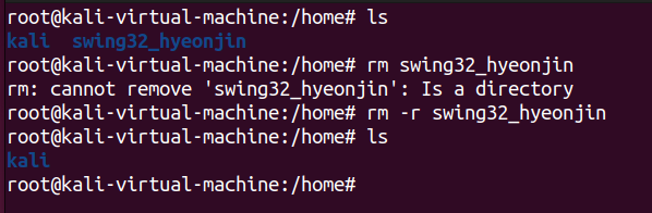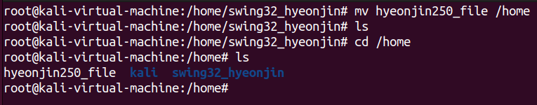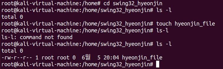 먼저 /home 디렉토리에서 mkdir명령어를 사용해 swing32_hyeonjin 디렉토리를 생성했다. 생성 후 ls명령어를 통해 디렉토리를 출력했을 때, 방금 만든 디렉토리가 정상적으로 생성된 것을 볼 수 있다.