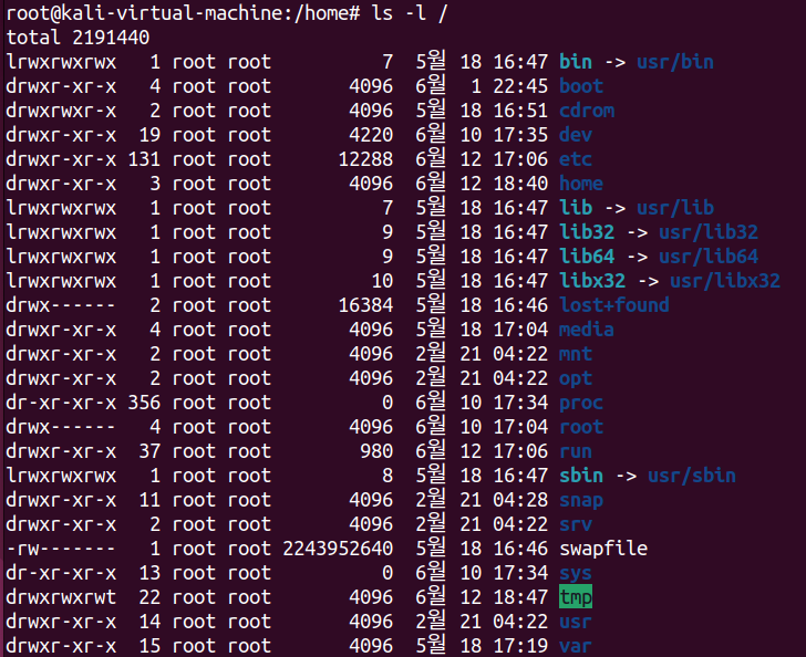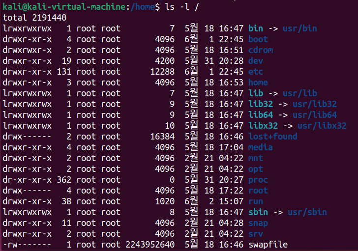 현재 디렉토리 뿐만 아니라 임의 디렉토리의 내용을 출력하는 것도 가능하다. root디렉토리인 / 디렉토리의 내용을 출력하는 #ls -l /을 실행하면 다음과 같은 출력값이 나온다.