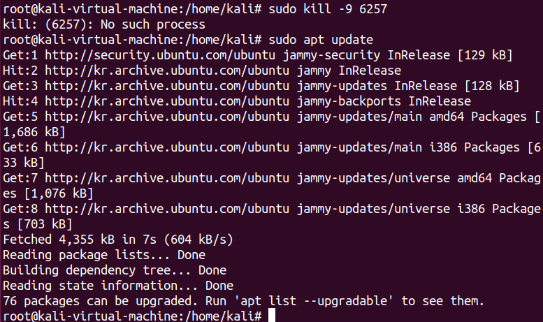 무슨 상황인지 몰라 일단 #sudo kill -9 [프로세스 번호] 명령어를 통해 6257 프로세스를 강제 종료 시켰다. 이후 다시 #sudo apt update 명령어를 입력했는데 아까랑은 다른 출력이 나왔다.
