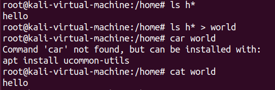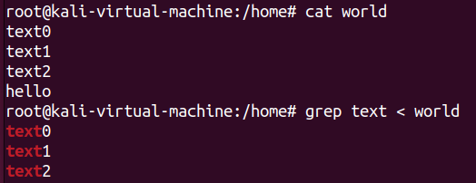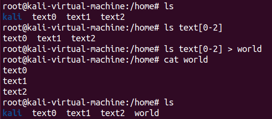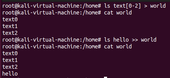 ls text[0-2]명령어의 결과물인 text0 text1 text2를 world 파일에 쓰는 예시이다. 내가 리다이렉션 지목한 파일이 없으면 새로 만들어진다는데, ls명령어를 통해 확인해보니 정말로 world 파일이 새롭게 생겼다.