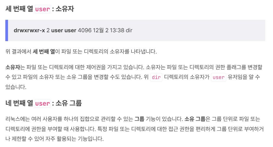 - drwxr-x---: 디렉토리로, 소유자에게 읽기/쓰기/실행 권한이 있고, 그룹에게는 읽기/실행 권한만 있음.