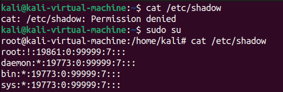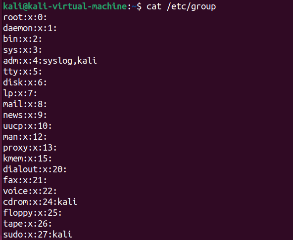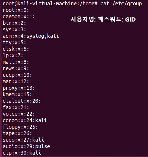 - 이후의 모든 문장: 현재 사용자가 속한 그룹의 목록을 보여준다. 사용자인 kali는 기본 그룹인 kali 외 다른 그룹에도 속해 있음을 보여준다. adm, cdrom....sambashare고 같은 다른 그룹에도 속해 있다.