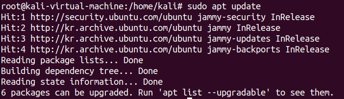 아래 화면은 #sudo apt upgrade 명령어를 통해 소프트웨어를 패키지를 업그레이드 한 후, #sudo apt update 명령어를 통해 다시 한번 목록을 출력해보았다. 아까와 달리 출력되는 목록 수가 줄어들었다. Hit는 해당 패키지 목록이 이미 최신 상태임을 의미한다.