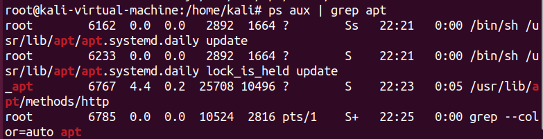 #ps aux | grep apt명령어를 사용해 실행중인 apt관련 프로세스를 확인해 보았다. 근데 위에서 보였던 6257이라는 보이지 않았다.
