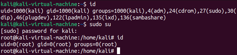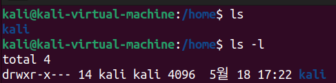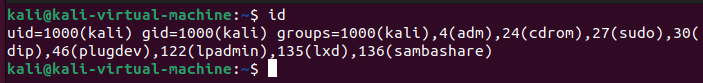 - uid=1000(kali): 현재 사용자의 UID는 1000이며, 사용자의 이름은 kali이라는 의미