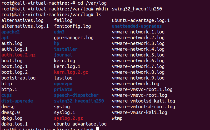 다음에는 디렉토리 위치를 /var/log로 이동한 다음 swing32_hyeonjin250 디렉토리를 생성했다. 마찬가지로 ls명령어를 통해 디렉토리를 출력했고, 파란색으로 표시된 것을 보니 정상적으로 디렉토리가 생성된 것 같다. 중요한건 이 작업 후 다시 /home 디렉토리로 옮겨 ls명령어를 통해 디렉토리 정보를 봤을 때, /var/iog에서 생성한 디렉토리는 보이지 않았다.