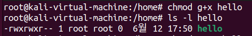 먼저 #ls -l hello 명령어를 통해 파일을 살펴보자. 아직 hello 파일에 일부 권한만 부여된 상태이다.