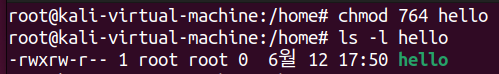 소유자는 읽고 쓰고 실행할 수 있고, 소유 그룹은 읽고 쓸 수 있고, 일반 유저는 읽을 수만 있도록 hello 파일을 수정해보자. 소유자 권한은 rwx이므로, 111=7, 소유 그룹 권한은 rw-이므로 110=6, 일반 유저 권한은 r--이므로 100=4이다. chmod 764 hello 를 실행하면 권한이 아래 사진과 같이 변경된다.