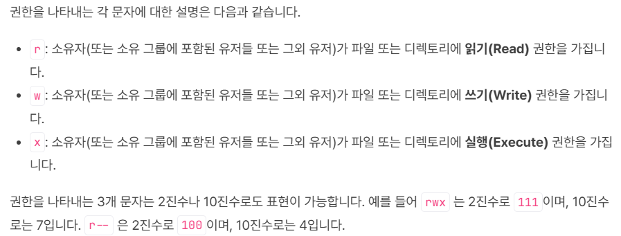 - 읽기(r): 파일 또는 디렉토리의 내용을 볼 수 있게 허용한다