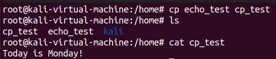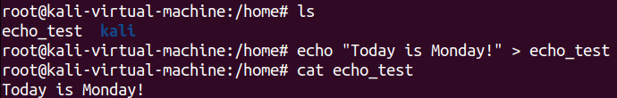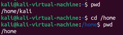 pwd(Print Working Directory)는 현재 작업 중인 디렉토리의 경로를 출력하는 명령어이다. 아래 실습 사진을 보며 이해해보자. 먼저 pwd를 통해 현재 작업 중인 디렉토리가 어딘지 살펴보자. /home/kali가 현재 위치한 디렉토리인 것 같다. 다음으로 #cd명령어를 통해 작업 경로를 변경한 뒤 pwd명령어를 사용해 보았다. 그랬더니 /home으로 경로가 바뀌었다.