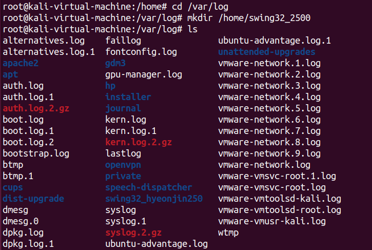 먼저 디렉토리 위치를 /var/log로 바꾼 다음, 해당 디렉토리에서 swing32_2500이라는 디렉토리를 생성했다. 아까와 달리 mkdir [특정 디렉토리 위치]/[새롭게 생성하는 디렉토리 명] 형식으로 작성한다. 아까의 경우를 생각해 보면, swing32_2500 디렉토리는 현재 위치한 /var/log디렉토리에 생성되야한다. 하지만 ls를 통한 디렉토리 목록을 보면, 새롭게 만든 디렉토리가 없는 것을 볼 수 있다.