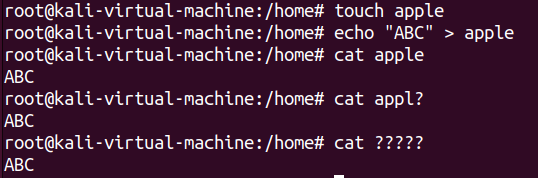 ls를 통해 apple.txt / apple1,2.txt/ apple11,22.txt 파일을 확인할 수 있다. 각각의 파일에는 1,2,3,4,5라는 내용이 들어있다. 임의의 1개 문자로 대체되는 ?를 사용하면, 파일명의 글자수와 와일드카드 개수가 동일한 파일만 출력된다.