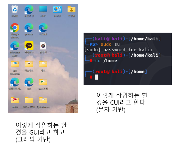 우리가 윈도우를 사용할 때는 주로 Grapical User Interface(GUI)을 통해 다소 편리한 사용성을 누리며 컴퓨터를 사용한다. 하지만 보안을 공부하면서 전문적으로 linux를 배우고 사용하려면 Character User Interface(CUI) 기반의 터미널을 주로 사용하게 된다.