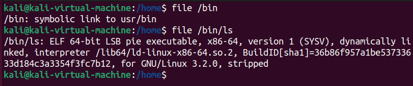 파일의 유형을 출력하는 명령어이다. file 파일경로 형식으로 사용한다. 아래 실습은 /bin/ls 파일의 유형을 출력하는 모습이다. /bin/ls 파일은 ls명령어를 입력하면 실행되는 실행 파일이다.
