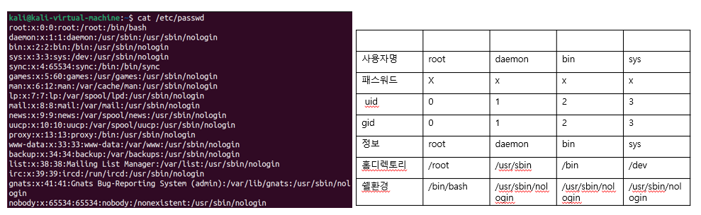 - /etc/passwd: 사용자 계정 정보가 저장된 파일