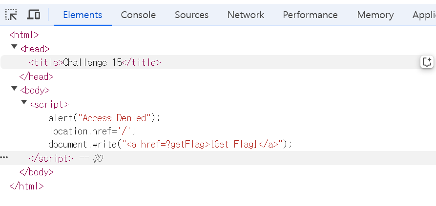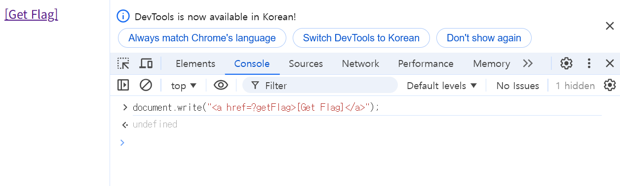 document.write 부분에 <a href=?getFlag>가 있으니 이 부분을 콘솔창에 입력하면 아래 주소로 이동할 것이다. 이는 ?쿼리문을 작성하는 것과 동일하게 작동한다(둘다 url 주소 뒤에 ?가 붙게되니).